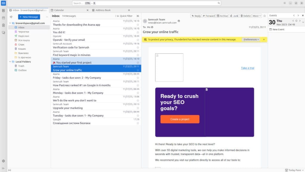 Інтеграція з календарем робить поштовий клієнт Thunderbird відмінним інструментом для тих, хто шукає повний набір функцій для ефективного управління як поштою, так і плануванням. Це стає особливо важливим для бізнес-користувачів та тих, хто активно веде свій графік.