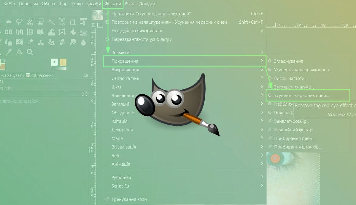 Перейдіть до панелі інструментів та виберіть інструмент Фільтри -> Покращення -> Усунення червоних очей.